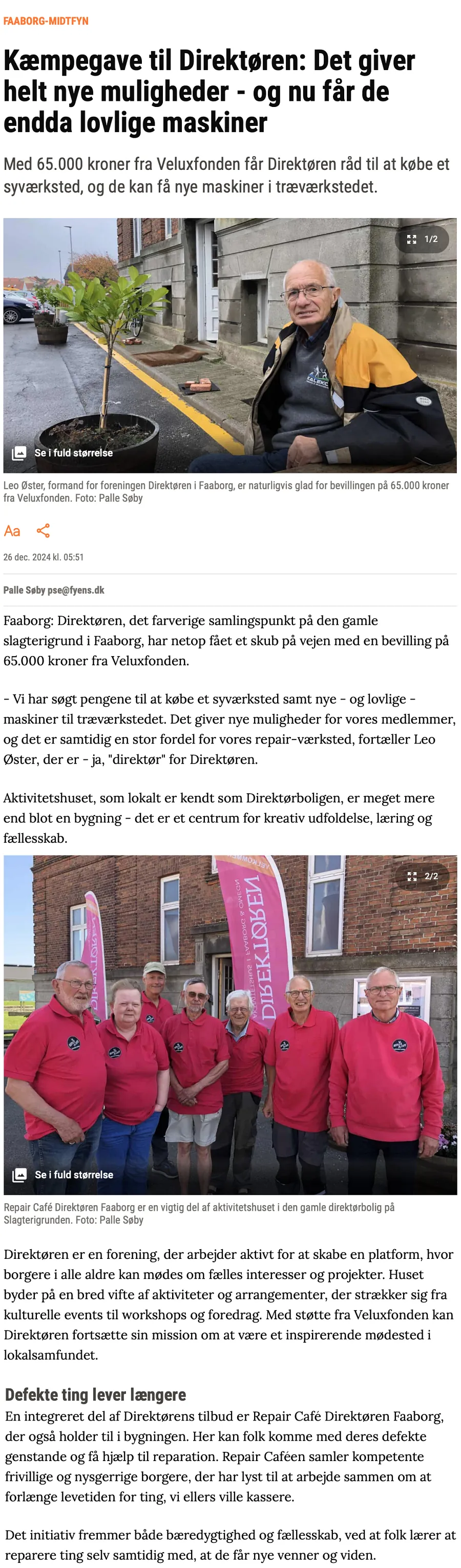 Åbnet hver torsdag fra kl 14 til 16 Adresse: Direktøren, Havnegade 5, 5600 FaaborgHer kan man parkere uden for døren og vi er klar til at tá imodPå gensyn i vores Repair Café
